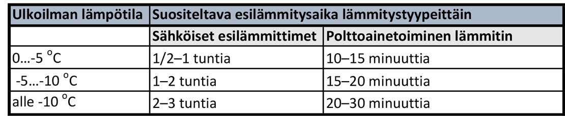 Käyttöolosuhteissa saatujen kokemusten perusteella raskaan ajokaluston esilämmitysajat saadaan kertomalla yllä olevan taulukon luvut 1,5–2,0:lla.